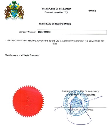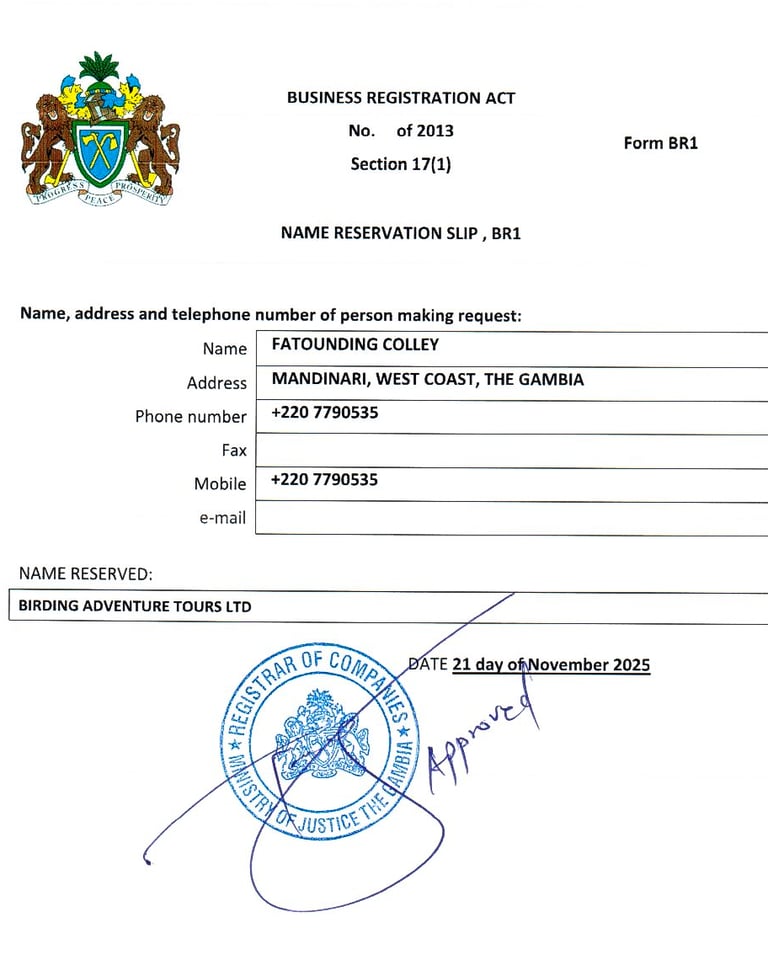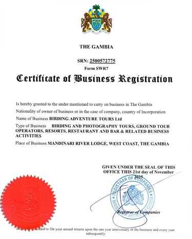 Mijn onderneming Birding Adventure Tours LTD is officieel geregistreerd én erkend bij de Gambia Tourism Board en heeft haar hoofdzetel in Mandinari River Lodge, West Coast, The Gambia. Hierdoor kan ik iedere reiziger die door mijn onderneming wordt begeleid of gegidst eerlijke en veilige rondreizen aanbieden, volledig ondersteund door de Gambia Tourism Board.